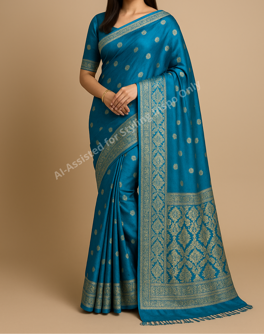 Dive into regal elegance with our Ferozi Blue Banarsi Silk Saree, crafted in a striking Ferozi Blue tone that exudes sophistication. The rich banarsi silk body features delicate golden booti motifs and soft zari work that catches the light with quiet brilliance.