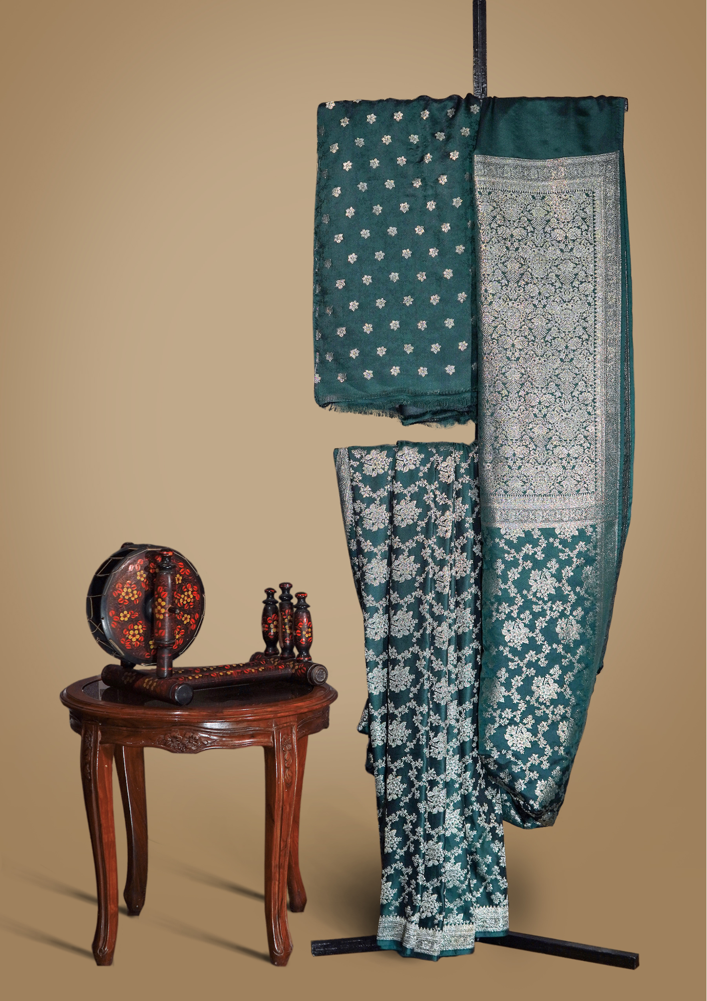 Woven in 7.25 yards of soft Banarsi silk, detailed with golden zari work throughout the length and aanchal. The deep green base adds a majestic flair.